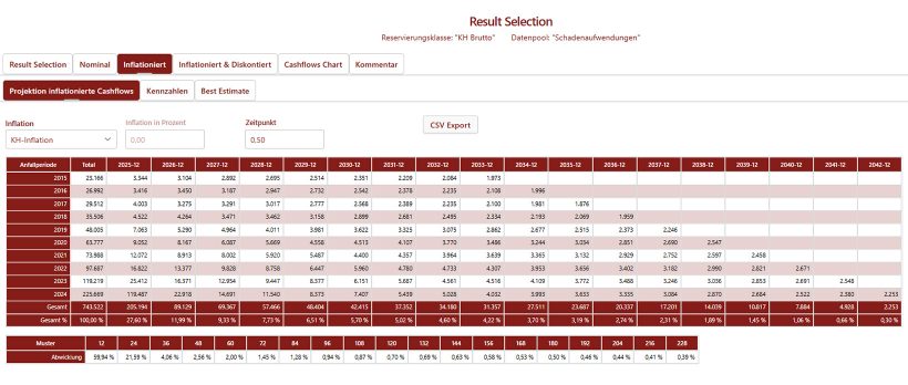 Hierfür stehen Kennzahlen und Grafiken zur Verfügung, die bei der Kalibrierung und Validierung der Reserve-Ergebnisse unterstützen. Darüber hinaus unterstützt die Result Selection das Ausrollen der Zahlungsströme auf die künftigen Abwicklungsperioden.