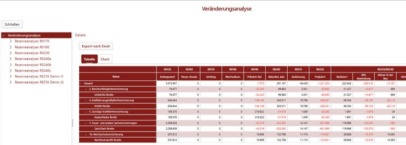 Mit der Solvency II-Umgebung bietet RESTA die Möglichkeit, die Ergebnisse der Reserveanalyse direkt als QRT zu exportieren. In RESTA können Sie außerdem bequem die unter Solvency II erforderliche Veränderungsanalyse erstellen und ebenfalls direkt als QRT exportieren. Aktuell bietet die Solvency II-Umgebung somit Unterstützung für die QRTs: